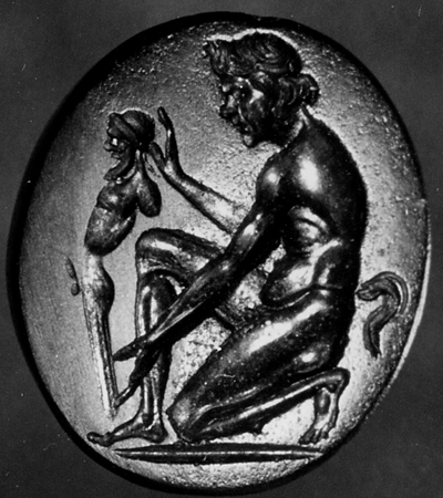 Horned Pan with goat legs steps forward holding out a ram's head, and on his other arm a lagobolon and goatskin. Ground line.
