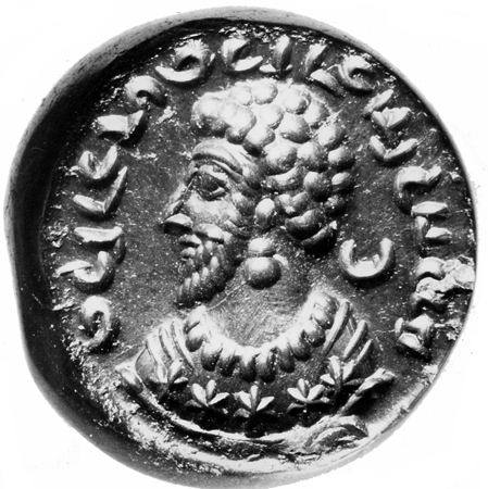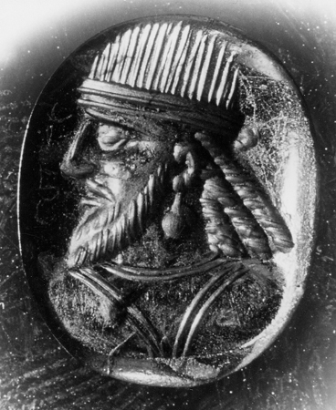Bust of a man with star-decorated dress; a crescent. Inscribed in Pahlavi plnbg ZY plnbg'n: l'st: 'Farnaby, son of Farnaby'. The name means Glory-god, the name of a Zoroastrian deity (D. Bivar).