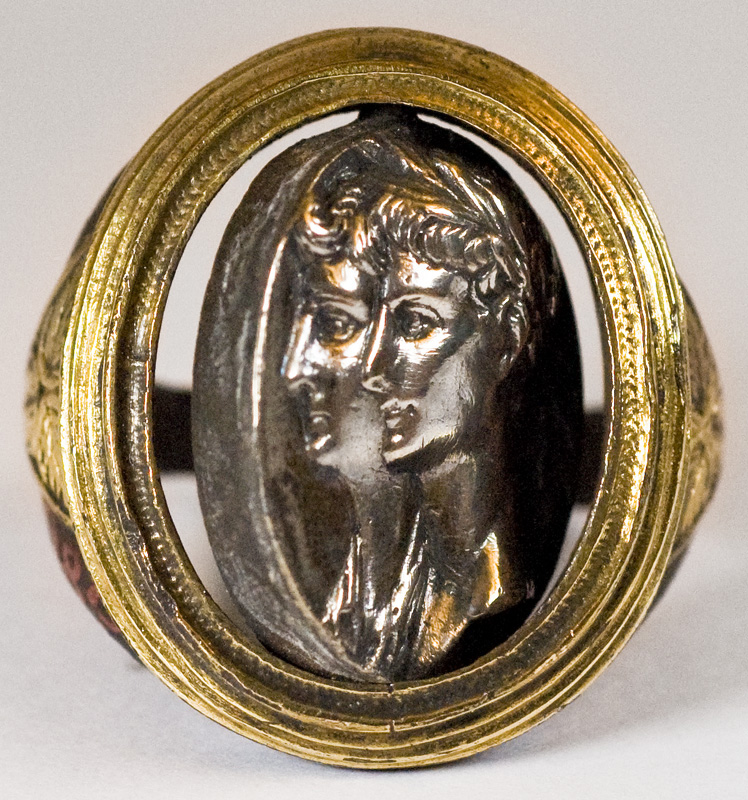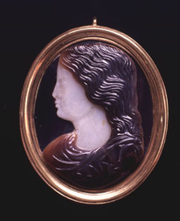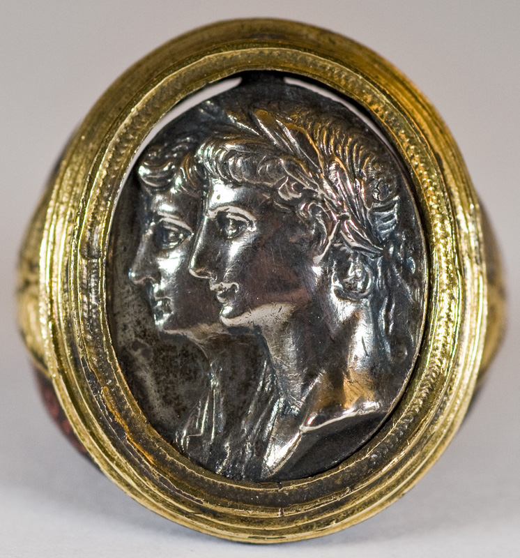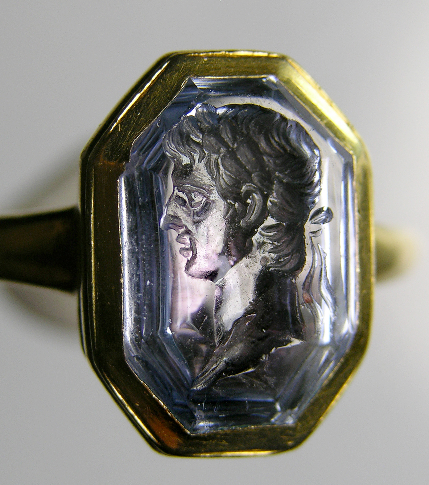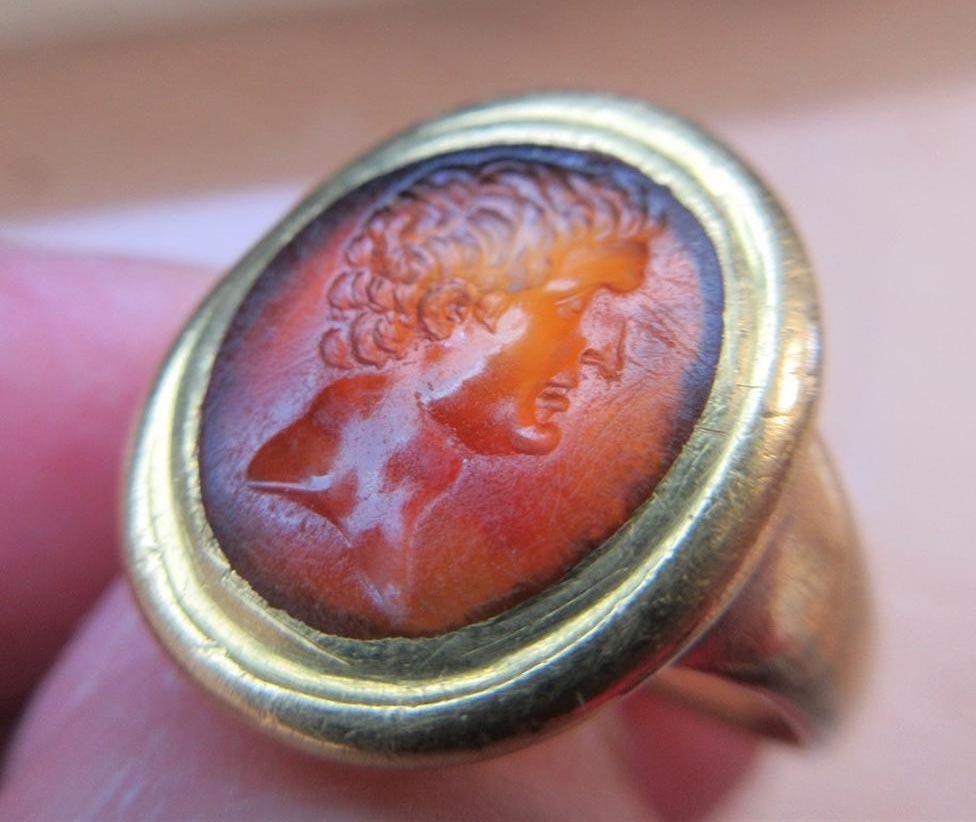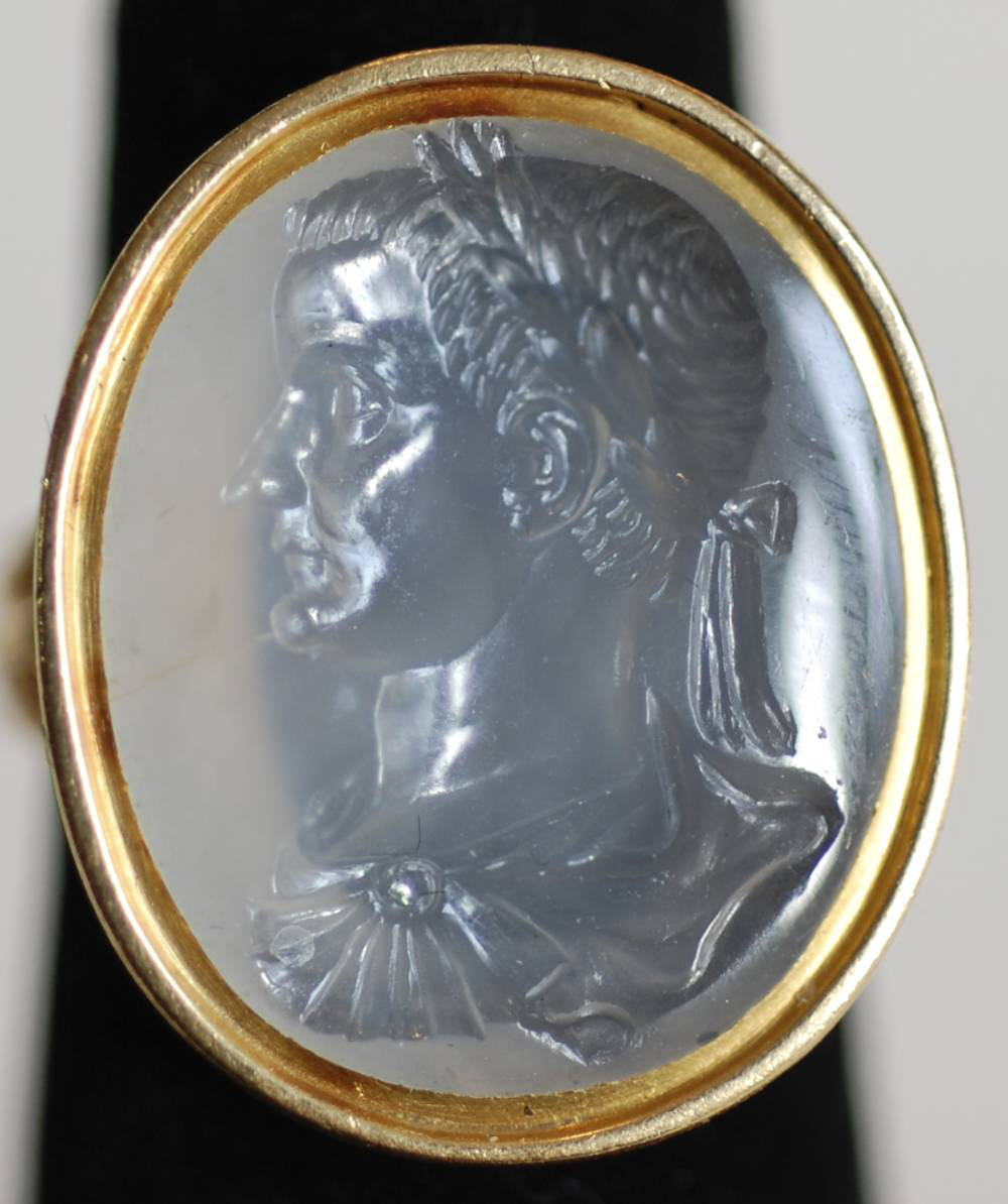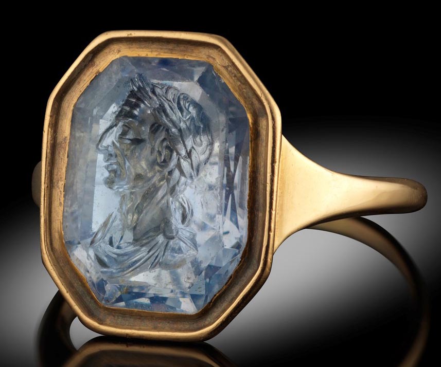 The intaglio is described as a 17th Century chalcedony intaglio of a 'young Nero'.