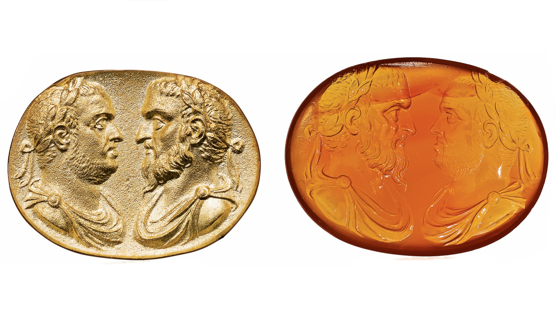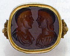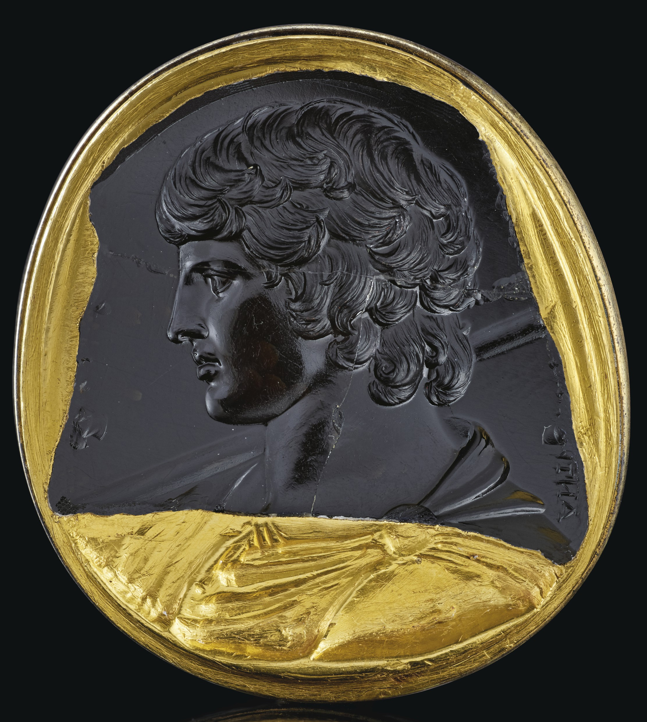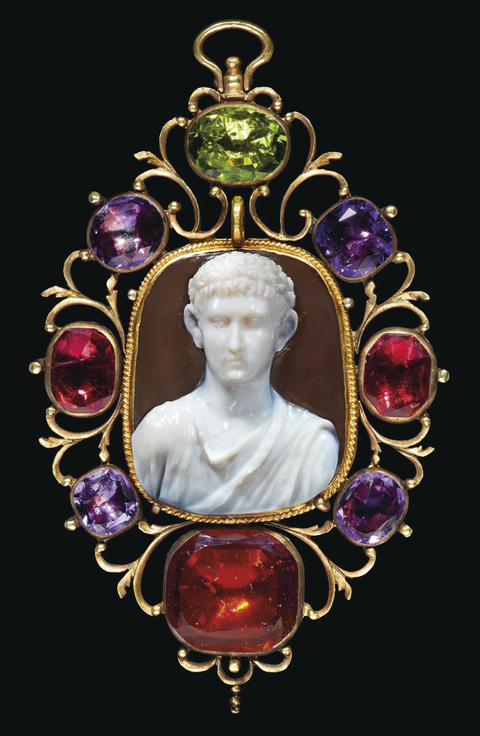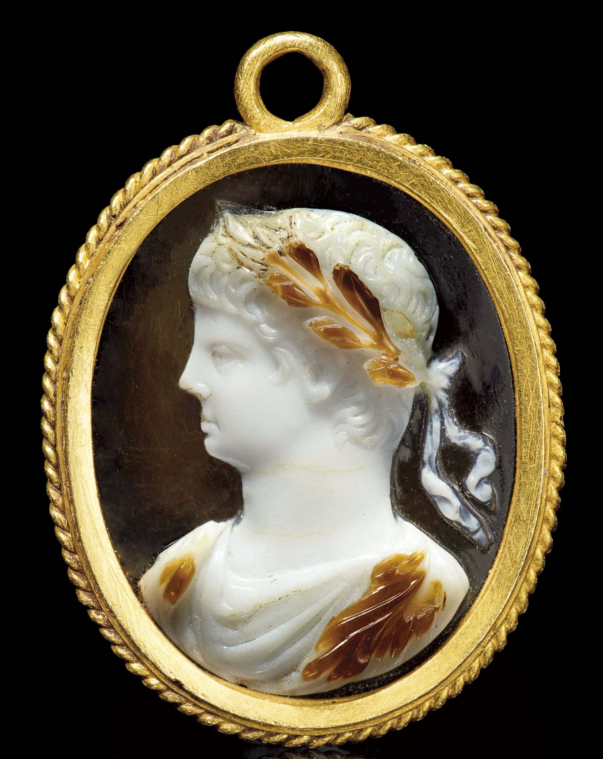 The intaglio is described as a 17th Century chalcedony intaglio of a 'young Nero'.