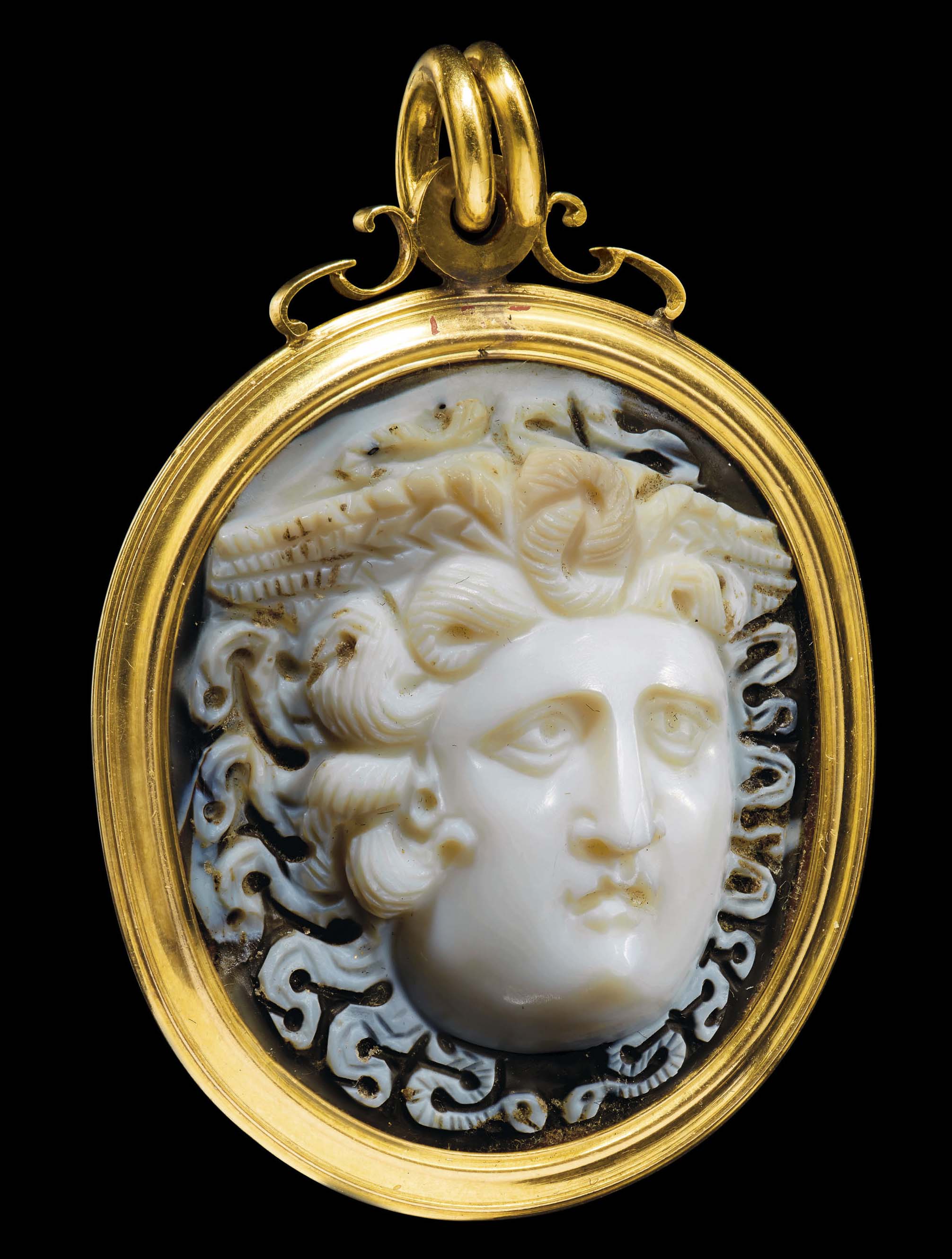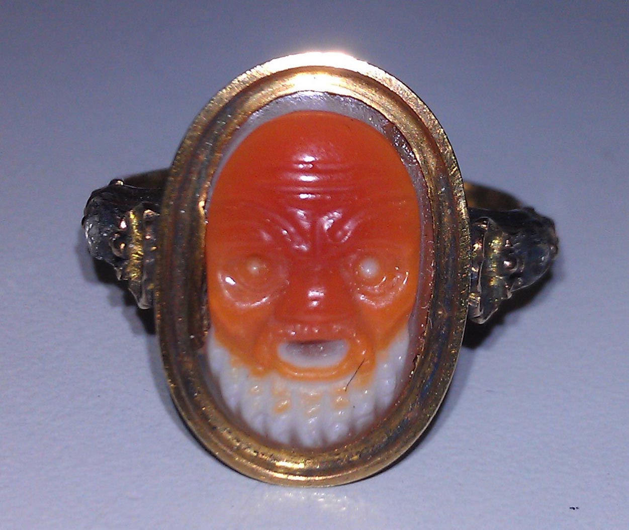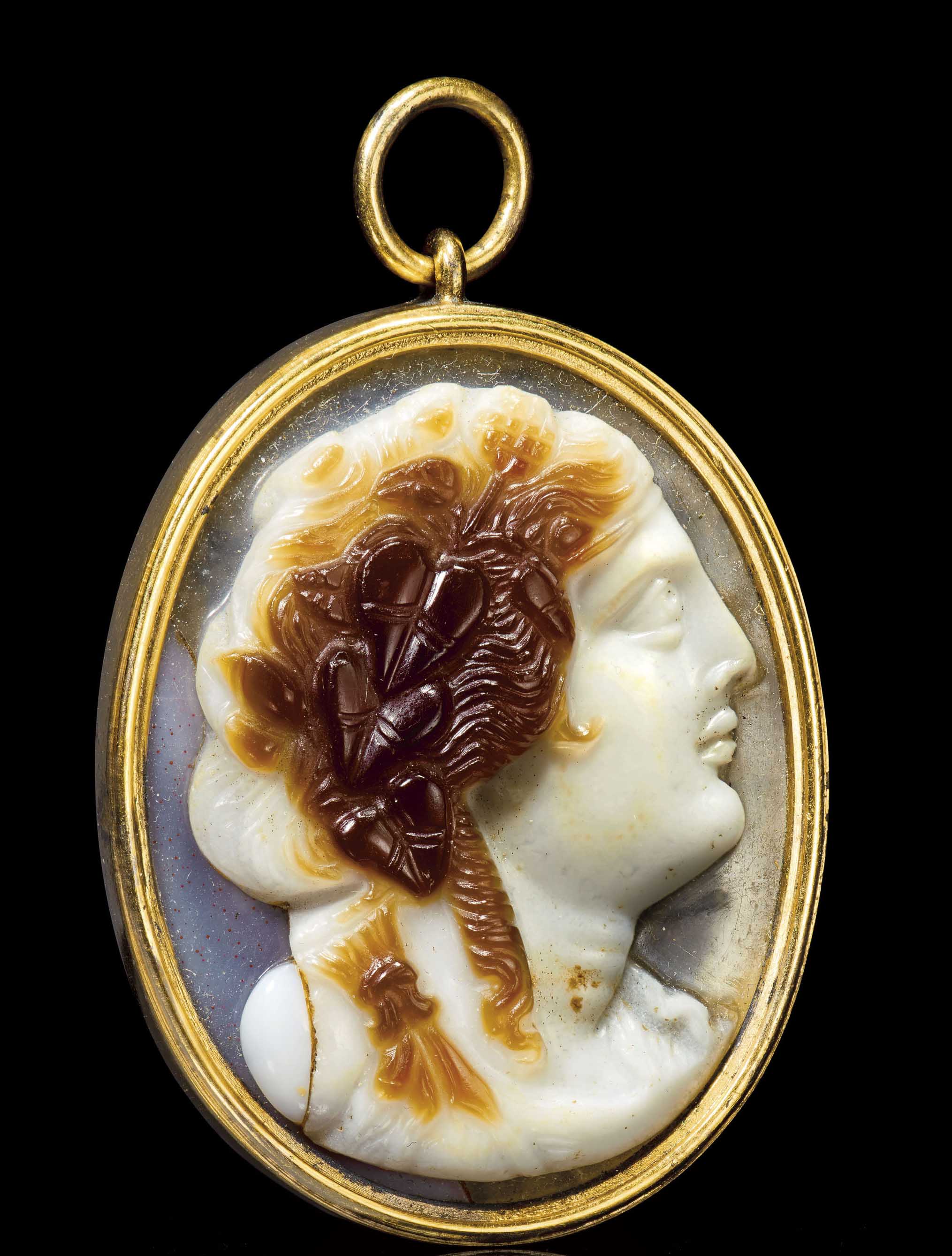 The oval stone is carved from layered agate, with two distinctive layers of cream above translucent brown, which Story-Maskelyne had wrongly thought to be 'glass imitating onyx'.