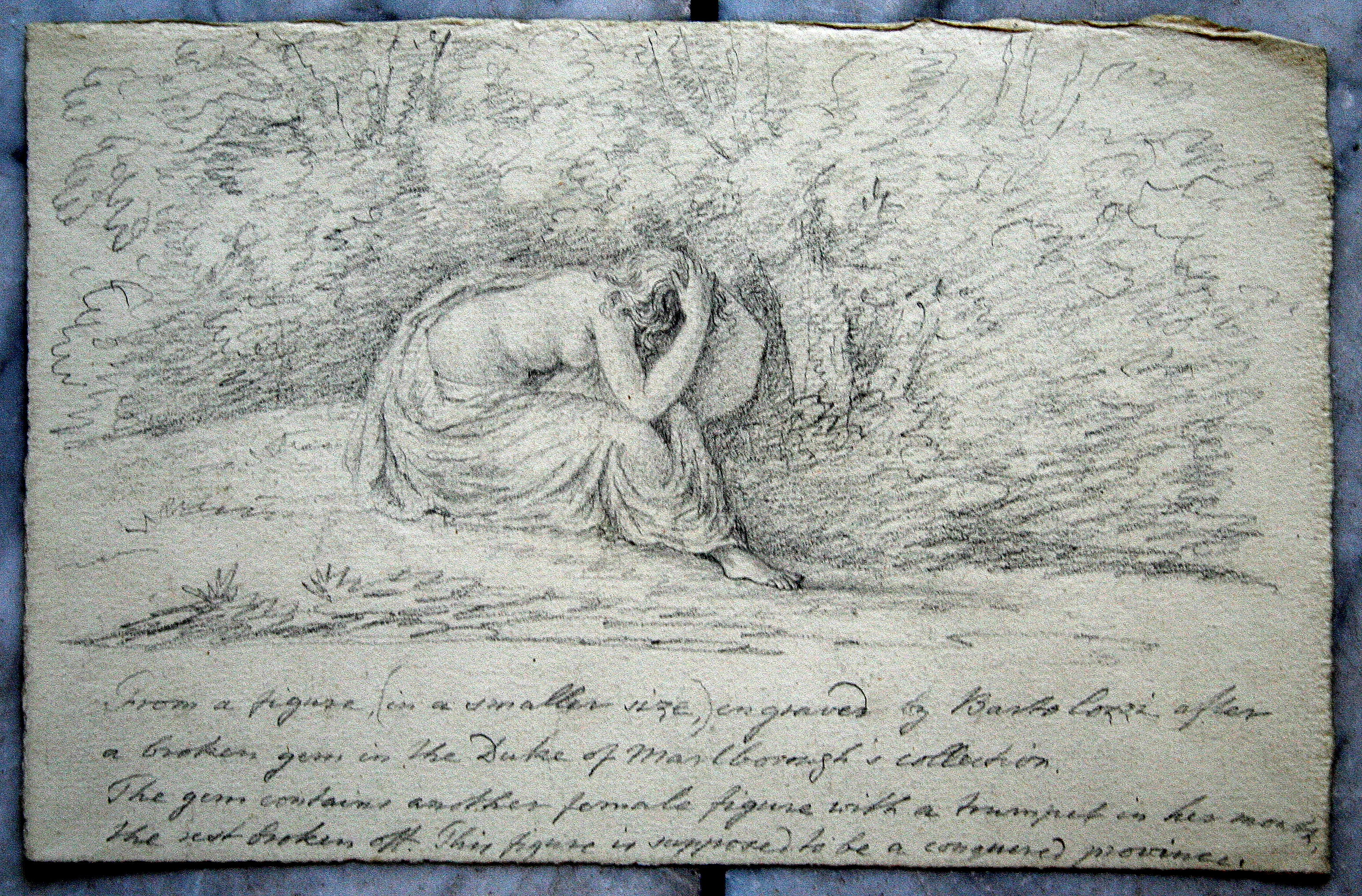 This charming drawing, inspired by the seated grieving woman on the Marlborough gem, has recently been brought to our attention by James Baxendale. The drawing (circa 1770) is by Mary Hartley (1736-1803).The inscription (by Mary Hartley) to the drawing is ‘From a figure, (in a smaller size,) engraved by Bartolow’ after a broken gem in the Duke of Marlborough’s collection. The gem contains another female figure with a trumpet in her mouth, the rest broken off. This figure is supposed to be a conquered province’.