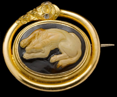 The brooch had belonged to the great-grandmother of the current owner. Jane Davies (1877-1972) lived in London from around 1900 until she was 91. She then came back to Pembrokeshire where she lived until her death in 1972 at the age of 95. The brooch was passed along the female line. Sara Crisp managed to identify the brooch as one of the missing Marlborough gems when she searched for 'cameo dog' on Google images and recognized the Beazley Archive picture of the electrotype.