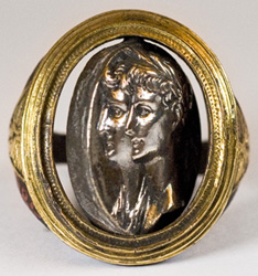 Belvoir Castle. Iron swivel ring with silver relief. Behind it is a cornelian intaglio.