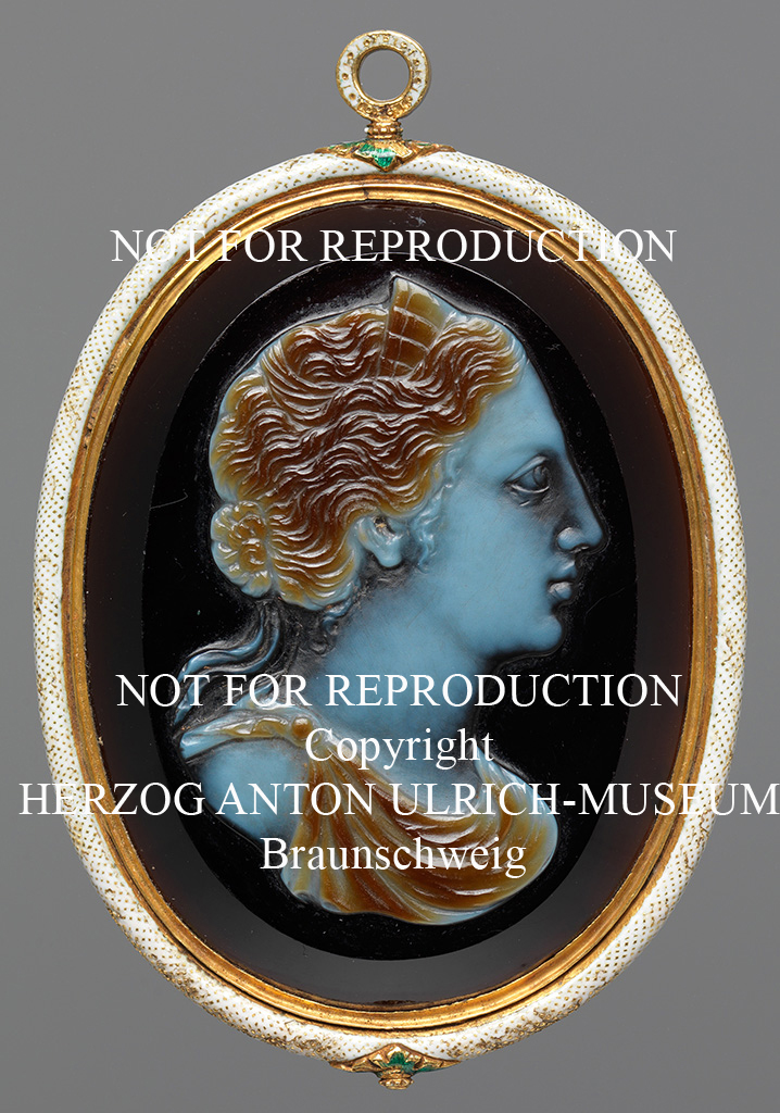 This drawing of the gem in the British Museum was sold at Sotheby's NY, Wednesday 28 April 2010 (lot 41). It shows the cameo in its original frame (now lost), which reconstructed missing parts of the cameo and added drapery to the inner parts of the busts in gold.