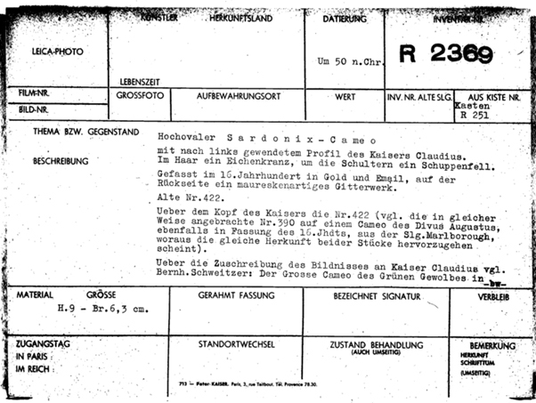 The Claudius Cameo appears in the Database of Art Objects at the Jeu de Paume, listed as one of the pieces of cultural plunder seized by the Einsatzstab Reichsleiter Rosenberg: (http://www.errproject.org/jeudepaume/card_view.php?CardId=8285).