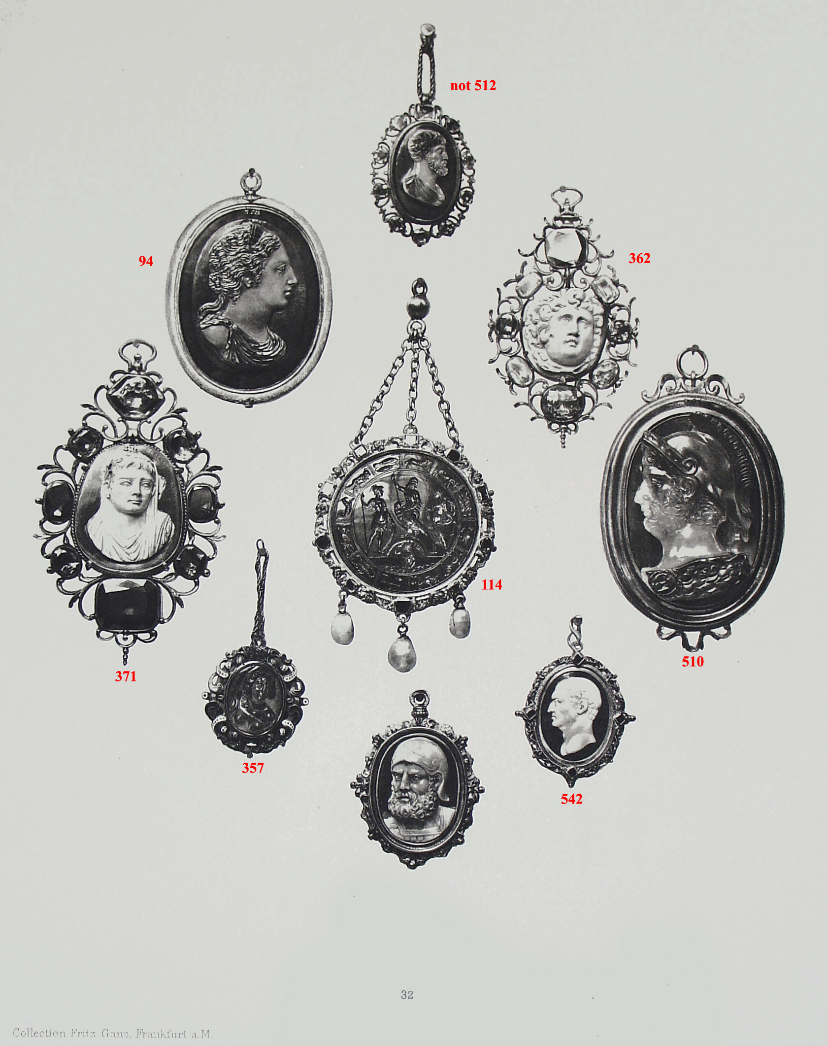 The following were in the Collection Fritz Gans (Friedrich L. von Gans, Frankfurt), published on plate 32 of his collection: 94, 114, 357, 362, 371, 510, 542 and an unidentified cameo (Oxford electrotype misnumbered 512).