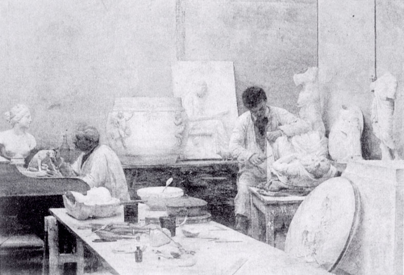 Even more influential in the diffusion of antique art was the establishment in Paris of the atelier de moulage, seen below, in an oil painting of 1884. Plaster copies of the famed sculptures could be made and distributed widely.
