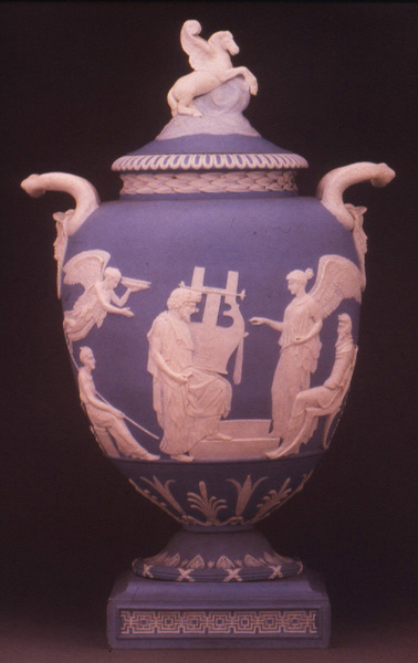 In England Josiah Wedgwood himself presented the Pegasus Vase to the British Museum in 1786. This famous piece takes its decoration from a 5th century BC Athenian clay vase which belonged to Sir William Hamilton, was published in the following engraving by d'Hancarville in the 1770s, and later sold to the British Museum.