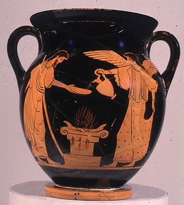 Small storage pot (neck-amphora) assigned to the Berlin Painter; vase and drawings.