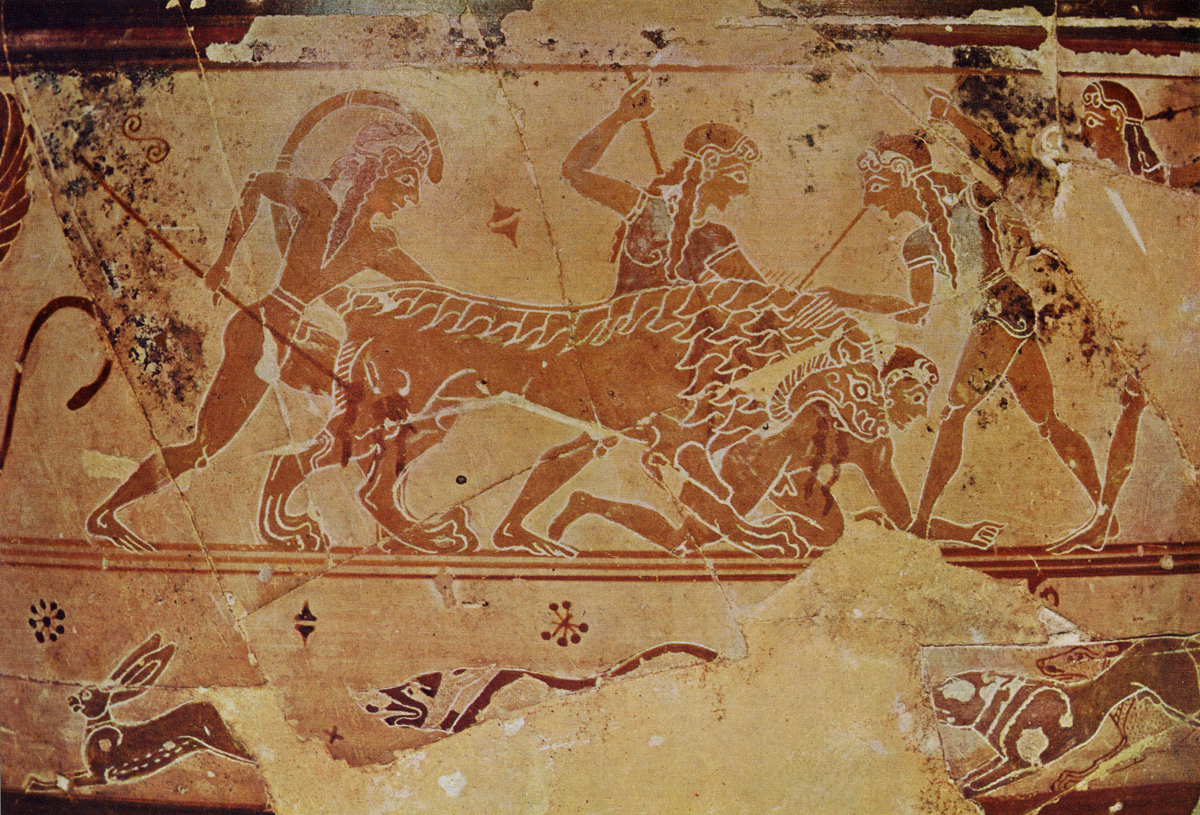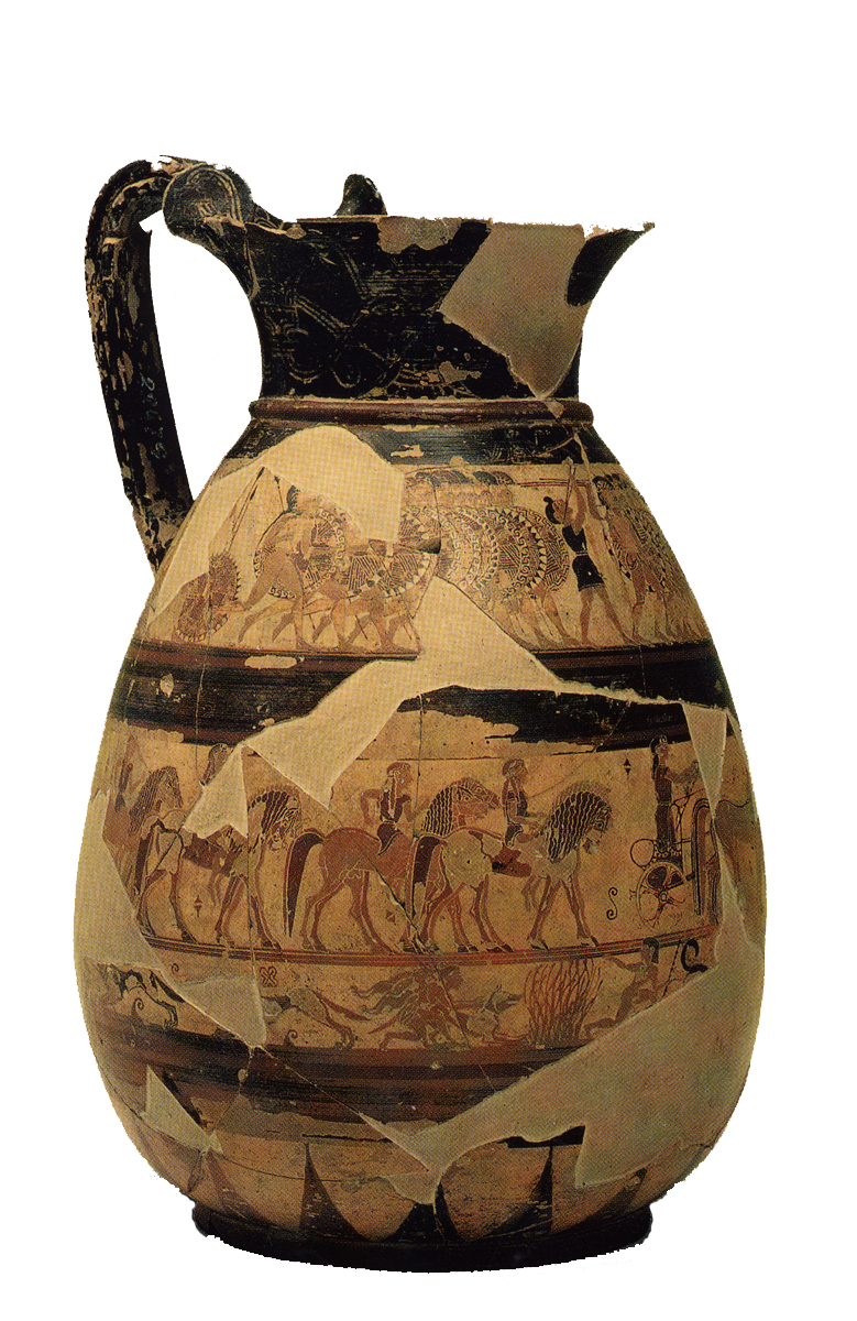 Analysis: unusual techniques of decoration, fine potting and painting, and multi-theme figure decoration suggest a special piece. Hoplite warfare was introduced at about the time this vase was made. Lion hunts that were known to have taken place in the East are copied. The hare hunt would have been common in Greece. Masculine themes suggest the vase was for men. It was exported in antiquity to northern Italy.