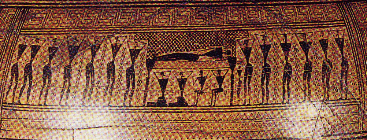 Decoration: geometric patterns, animal friezes (neck), laying out of the dead - the prothesis - (body)
