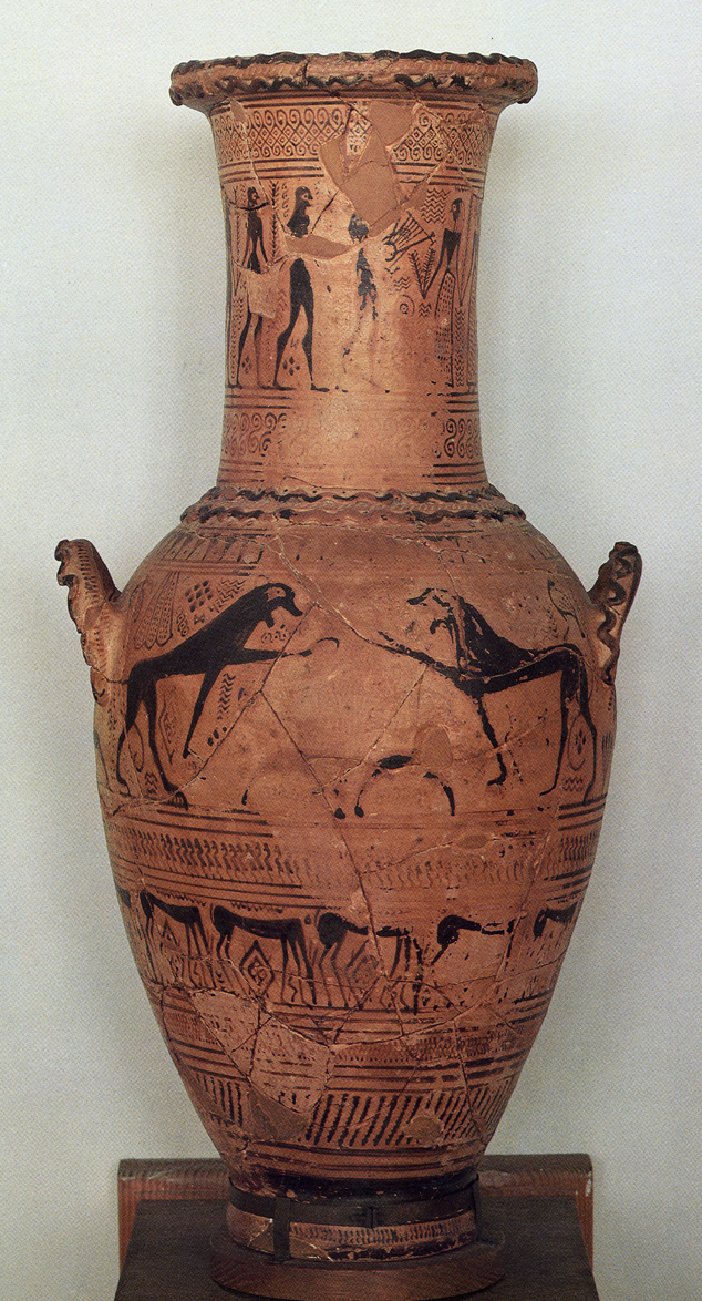 Analysis: curvilinear floral motifs and lions (largely effaced) are indicators of a new 'Orientalising' style in Athens, whereas the largely silhouette figures (neck) combine the old Geometric silhouette with outline. Branches and pipes suggest mourning.