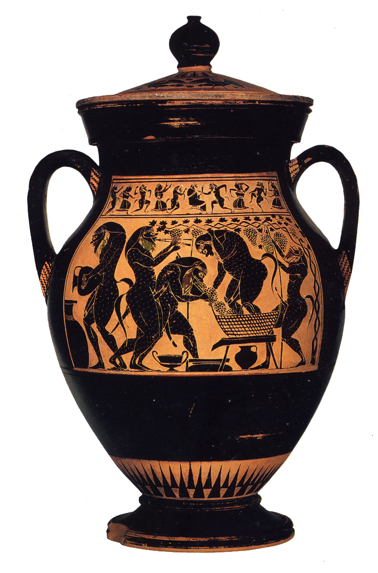 Subject/s: large, hairy satyrs in a vineyard, from right to left – picking, treading (while holding on to the vine), music-making and decanting (A), Dionysos (tipsy? dancing?), holding a kantharos and vine tendrils) is accompanied by satyrs who (left to right) make music, provide drink and dance, arms entwined. Above on both sides a miniature frieze of satyrs and maenads dance in the company of Dionysos, seated.
