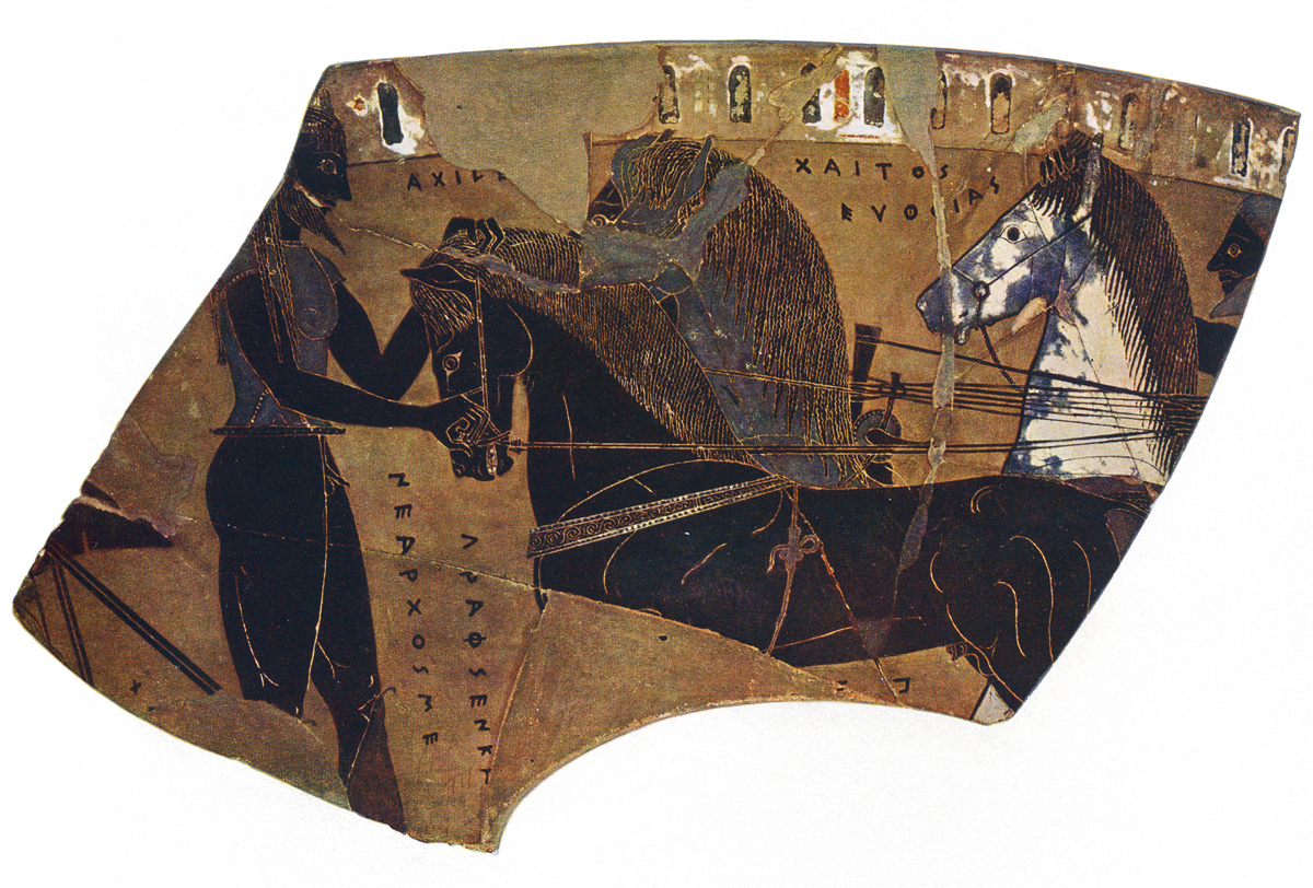 Analysis: unusual shape and technique (black and red tongue patterns painted on a white-slipped mouth rim), exceptionally fine draughtsmanship in figures and letter forms, indicate a special piece. Since it was found on the Acropolis it might have been dedicated there, before or after use.