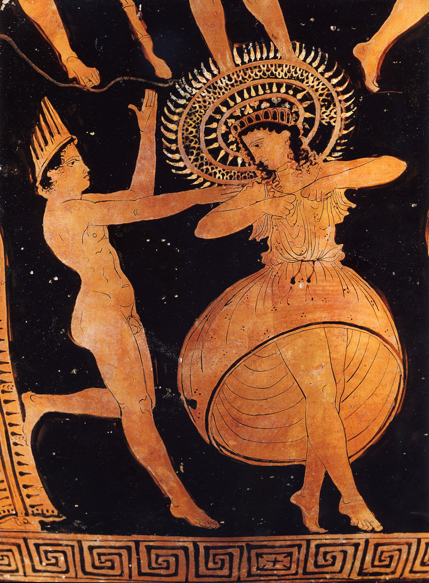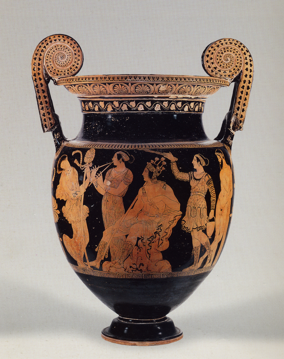 Analysis: 'figure-hugging' nearly transparent drapery and jewellery recall late 5th c. Athenian vase, e.g., Meidias Painter, but the 'fancy/exotic' dress and angst-ridden faces reveal local talent. The vase was found in the Spartan 'colony' Taras and the festival is known to have been celebrated in Sparta.