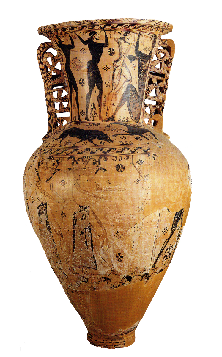 Subject: Alkmene sits on a pyre being lit by Amphitryon and Antenor. She gestures to Zeus who has throw his thunderbolts and sent clouds to 'rain on' the pyre. The clouds pour water. On the far right Eos watches.