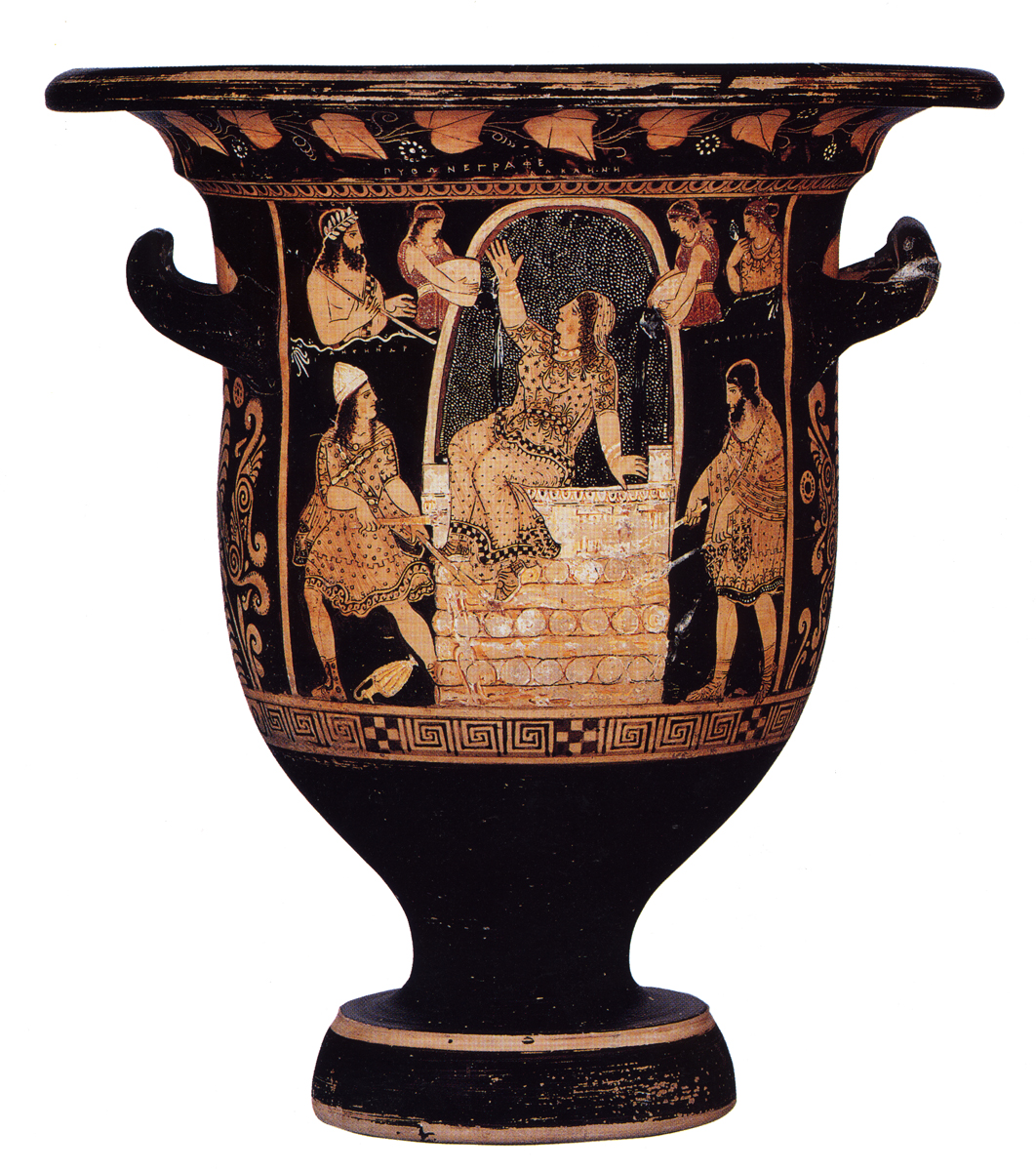 Analysis: the elaborate costumes and a near loggia effect of gods and personifications above suggest a scene from the theatre. Euripides wrote about Alkmene giving birth to Herakles.
