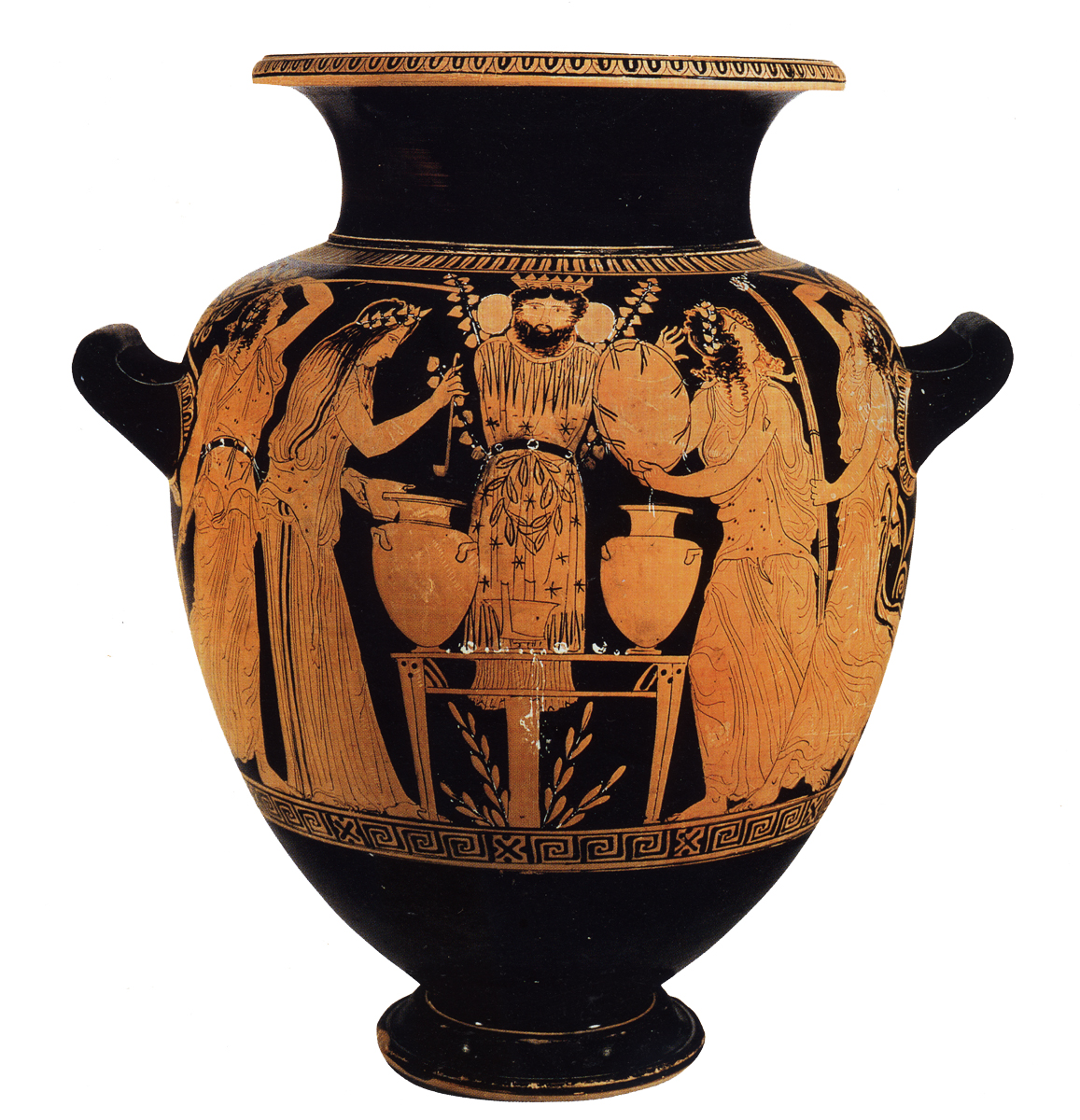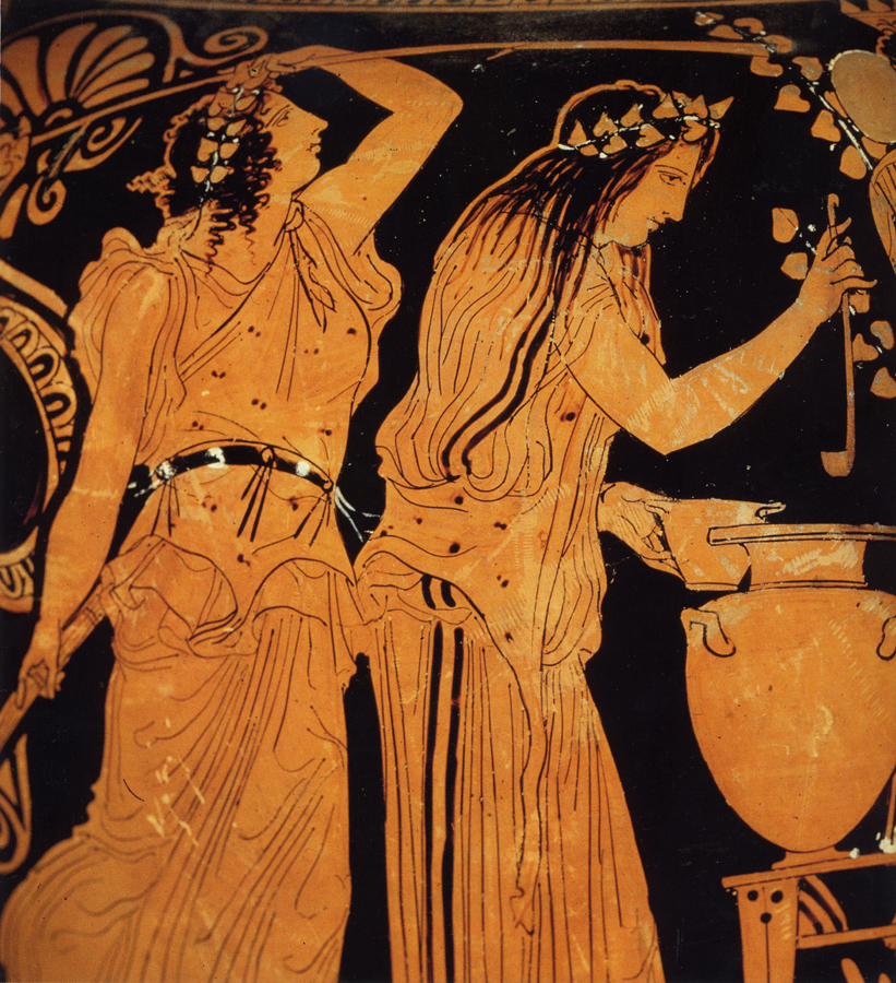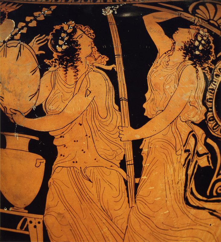 Subject/s: A. Women or maenads with thrysi and tambourines dance around a pillar idol of Dionysos, festooned with branches and set before a table holding two large stamnoi from which one maenad ladles wine into a skyphos. B. more maenads with thrysi and tambourines join the celebrations
