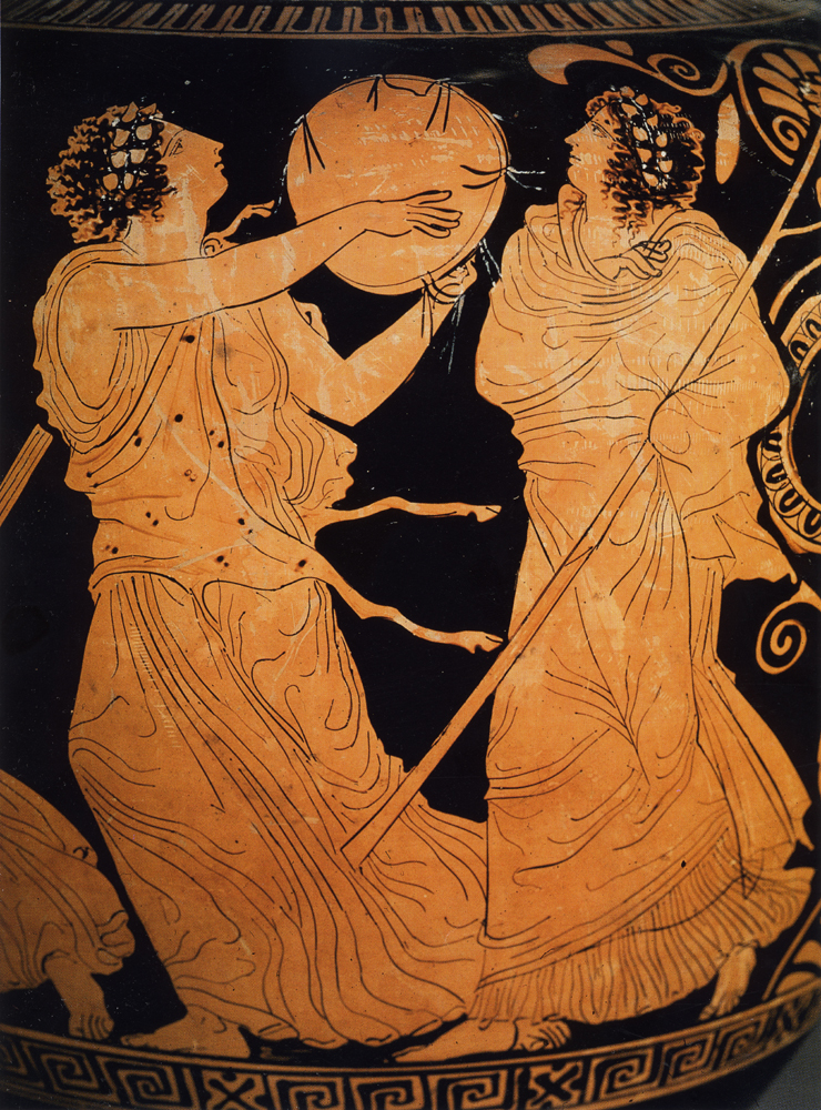 Analysis: the subjects are very like that of those on the earlier stamnos by the Villa Giulia Painter. Now the image of the god fastened to pillar suggests a festival of Dionysos. The tambourines are new and probably reflect their recent appearance in Athens with the cult of Bendis.