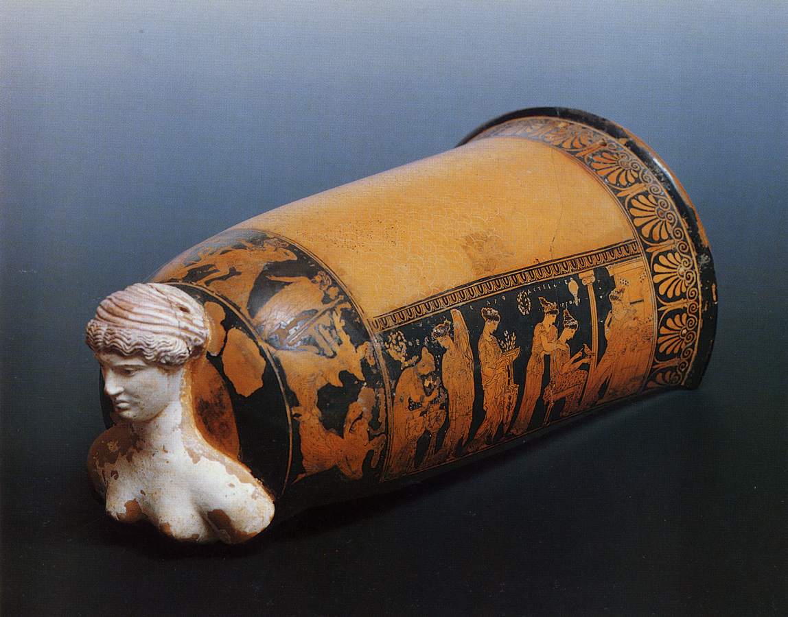 Technique: red-figure with a moulded female head (white with gilding and added colour)