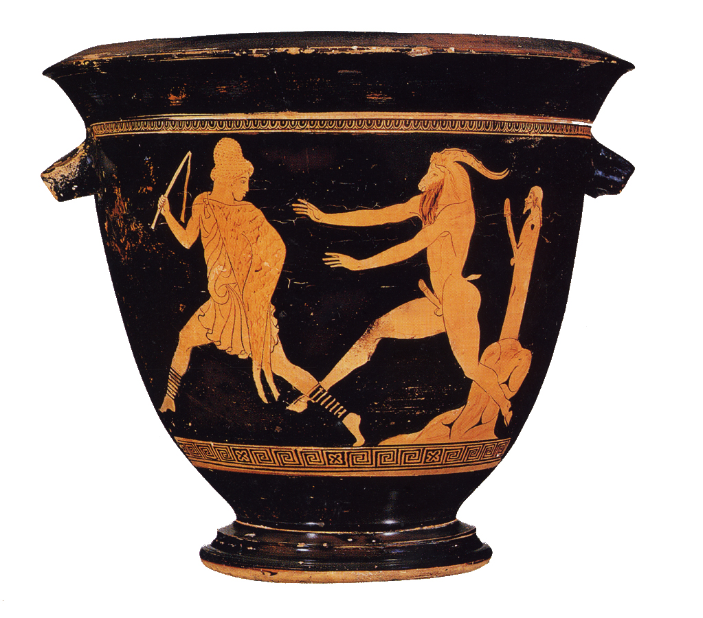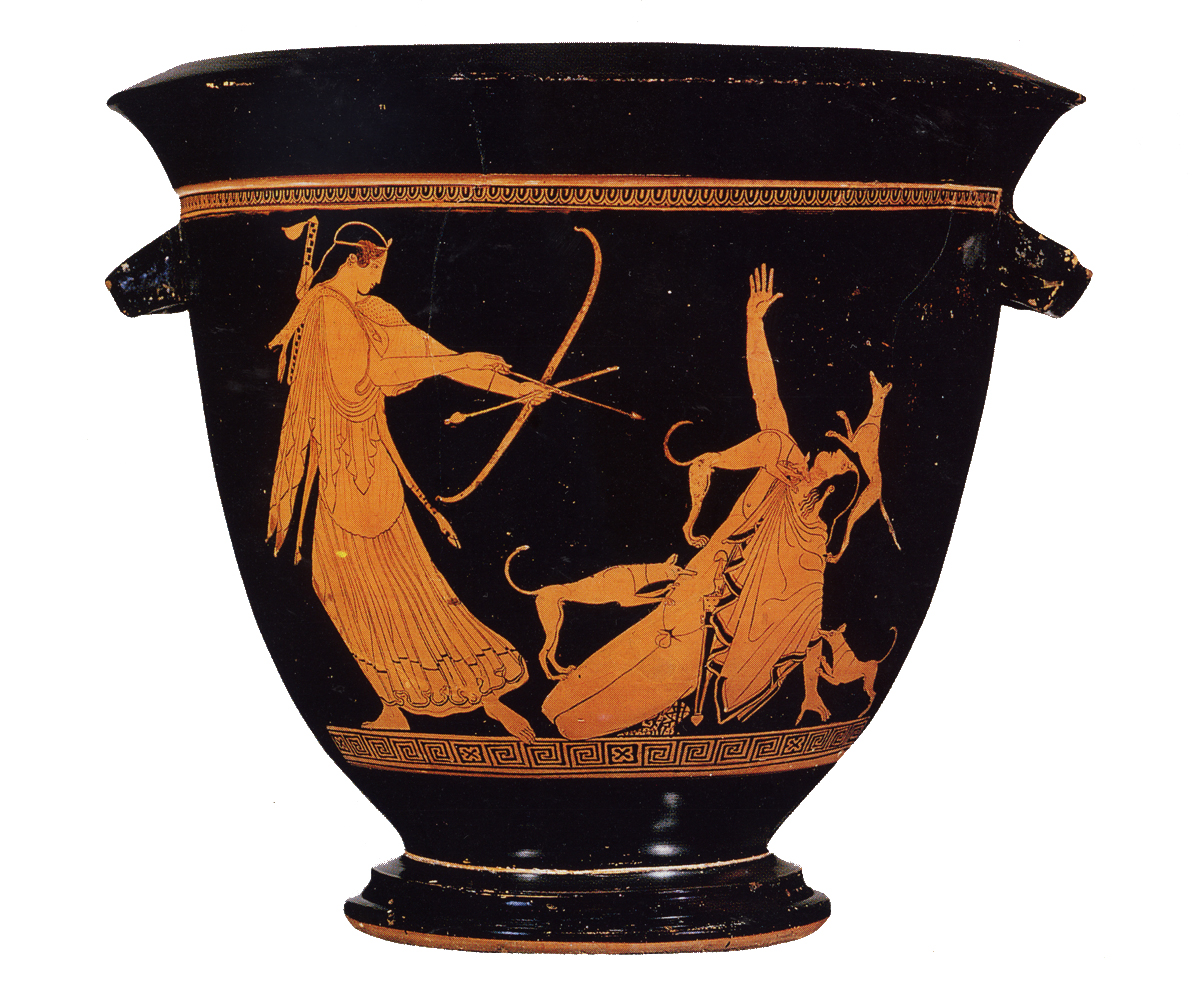 Analysis: bold designs on a finely made shape are hallmarks of the Pan Painter as a 'grand' Mannerist; notice Artemis's small, impossibly long torso and limbs, and 'archaic' pose and dress. The Aktaion story was told by Stesichorus in the 6th c., Pan was celebrated from the early 5th in recognition of his help routing the Persians.