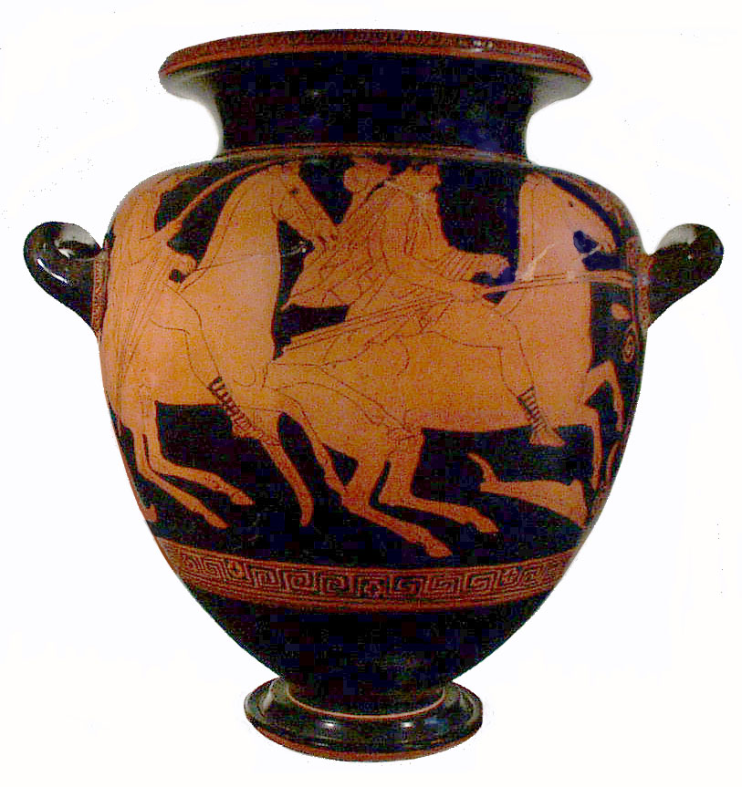 Subject/s: A. The sons of Zeus, Castor (Kastoris in the genitive ) and Pollux (Poludyeuke), wearing travelling dress (hat, cloak, boots) and carrying spear, ride over the sea indicated by a dolphin on the right. B. Three mantled youths, one (right) leaning on his staff. Sponge, strigil (scrapper) and halteres (weights) indicate athletic pursuits.