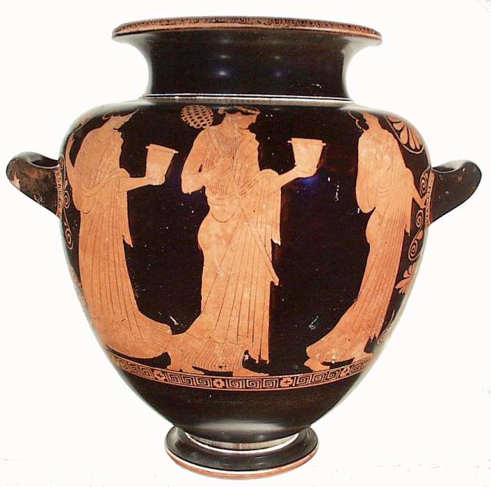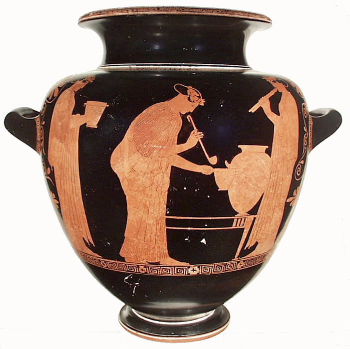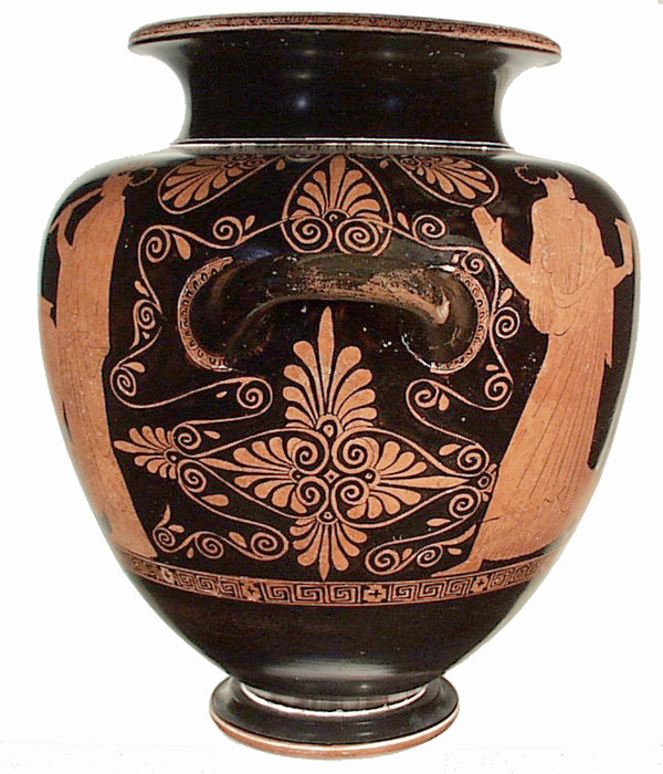 Analysis: the representation of a stamnos on a stamnos is a notable feature and characteristic of a group of stamnoi with similar scenes which may relate to a festival of Dionysus, god of wine. In style the motionless and widely set figures of side A are typical of an 'Academic'style of painting that seems to develop from Douris. The vase was found in Sicily at the site of Gela.