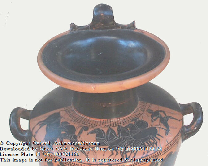 Between c.800 - c.300 B.C., the range of painted pottery shapes is relatively limited. Most look broadly similar throughout the period, but their variations and refinements can serve as a useful guide for relative dating. The Athenian examples cover all of the most important forms, although it is helpful to keep in mind local undecorated (coarse) and plain (black-gloss) wares, pottery from other regions, such as Corinth and East Greece, and other materials. Vessels made of metal, glass and wood tend not to preserve as well as pottery, and our record of shapes is consequently skewed in favour of the ceramic evidence. There are however a number of features in the pottery repertoire that seem more suitable to other materials, e.g., rivet-like attachments.