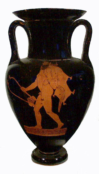 The Athenian askos (pl. askoi) is a small, round vessel with a flat bottom and an over-arching handle that joins the obliquely-angled neck. There is little room for extensive decoration, and often a pair of figures suffices.