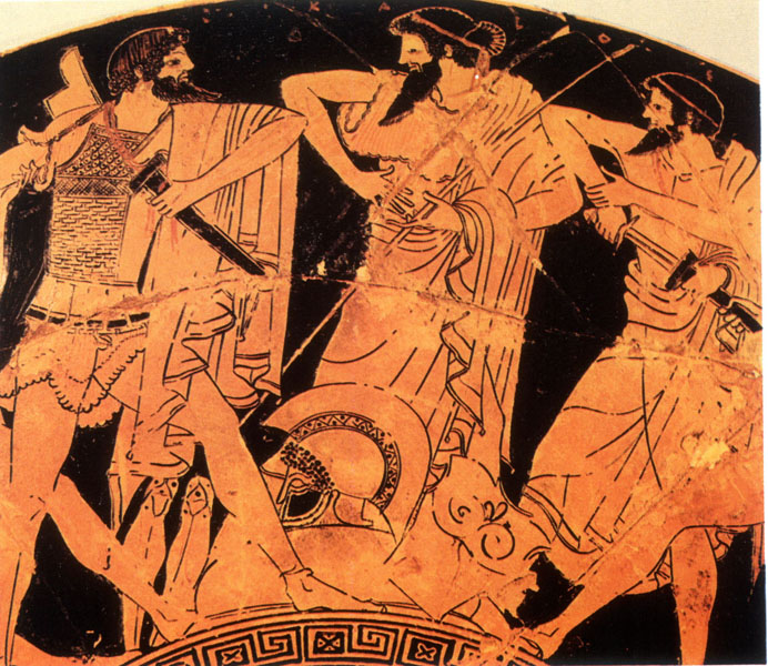 Above left: Agamemnon intervening between the quarelling Ajax and Odysseus. Detail from an Athenian red-figure clay vase, c.5th century BC. Vienna, Kunsthistorisches Museum © Kunsthistorisches Museum