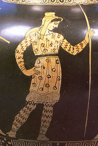 Antiope. They are shown like Greek warriors, but may carry battle-axes and may dress like Easterners (Scythians or Persians). The story of them cutting off one breast is a Greek explanation for their name ('