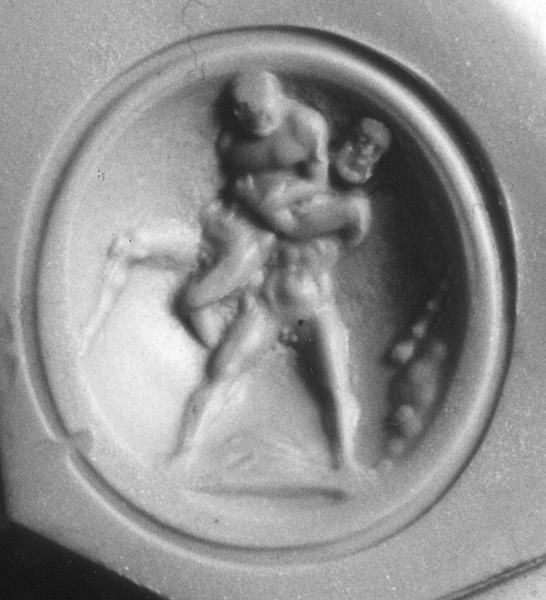 Above right: Herakles wrestles Antaios off the ground. Gem impression, Berlin collection 8236 © Furtwängler