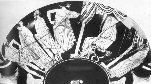 Above: Briseis led away from Achilles. Detail from Athenian red-figure clay vase, about 500-450 BC. London, British Museum E76. Photo. BM XXXVII B 56 © London, British Museum