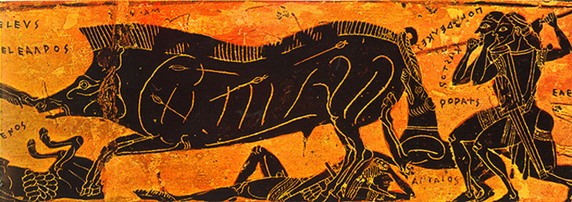 A monstrous boar sent by Artemis to ravage Arcadia, and the quarry of a band of heroes, led by Meleager (who kills it) and Atalanta (who struck it first). The Hunt becomes a favourite subject in art from the 6th century on, with the great boar as centrepiece.