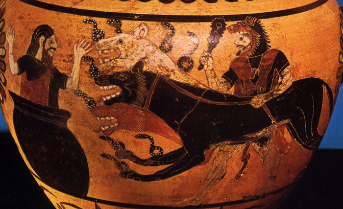 A three-headed dog who guarded the entrance to the Underworld, preventing the living from entering and the dead from leaving. The Twelfth and most dangerous Labour of Herakles was to bring Cerberus to Eurystheus. Hades, King of the Underworld, gave permission for Herakles to take Cerberus, on condition that he used no weapons, but only force, to drag him away. Herakles accomplished this Labour using only his immense strength. The dog is often given snaky extremities, and in later art may have just one head.