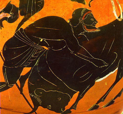 Herakles' seventh Labour was to bring to Argos a wild bull from Crete, said to be the same bull as the one in the myths about Europa and Pasiphae. He caught the beast alive, and showed it to Eurystheus before letting it go. After wandering about for some time the bull finally took up quarters in Marathon, where it was fought by the hero Theseus.