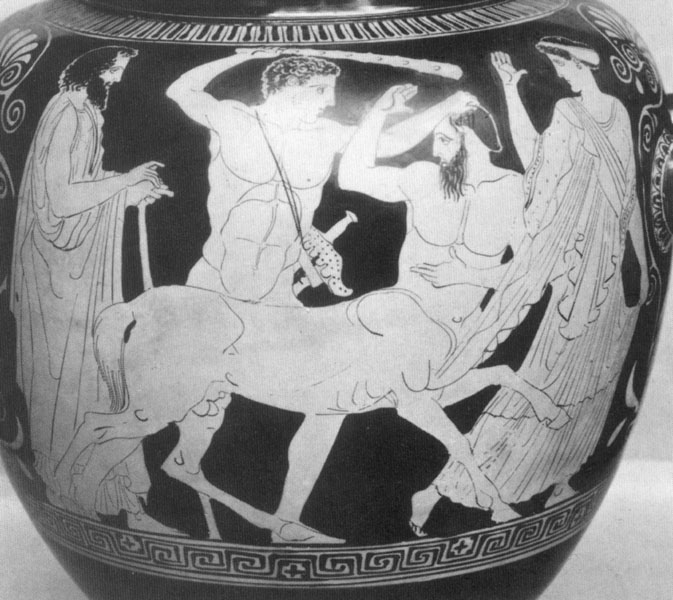 Above: Detail from Athenian red-figure clay vase about 475-425 BC. London. British Museum 98.7-16.5 © British Museum