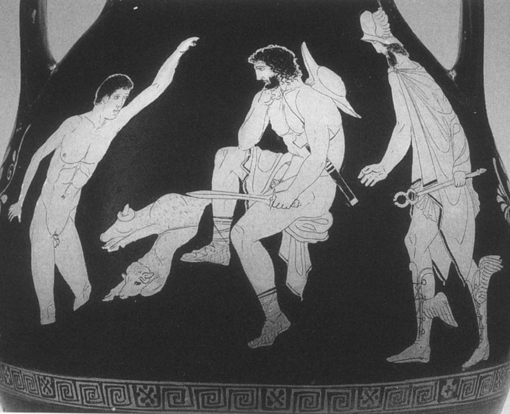 Above: Odysseus, Hermes and Elpenor. Detail from Athenian red-figure clay vase about 475-425 BC. Boston (MA) Museum of Fine Arts 34.79 William Amory Gardner Fund. Photo E3302 © Boston (MA) Museum of Fine Arts