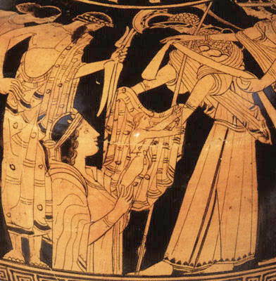Above: Detail from an Athenian red-figure clay vase, about 470-450 BC. London, British Museum E182 © British Museum