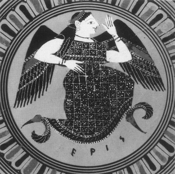 Goddess of Strife. In art she appears alone and winged, or at the wedding of Peleus and Thetis, where her intervention provoked the Judgement of Paris and eventually the Trojan War.