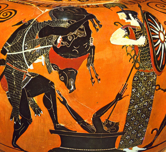 Above: Detail from an Athenian black-figure clay vase, about 510 BC. Paris, Musée du Louvre F59. © Musée du Louvre, Paris Licence Plate 11 UK 1007 142