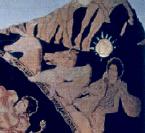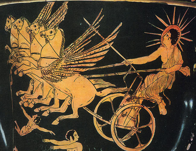 The Greek sun-god, shown as a young man in a chariot. He may have a disk, wings, or rays, emerging from his head. There was a colossal bronze statue of him at Rhodes, one of the Seven Wonders of the ancient world. Helios and Selene (the Moon) often frame classical myth scenes to give an indication of the passage of time. He is challenged by Herakles on the hero's journey to the west, to fight Geryon.