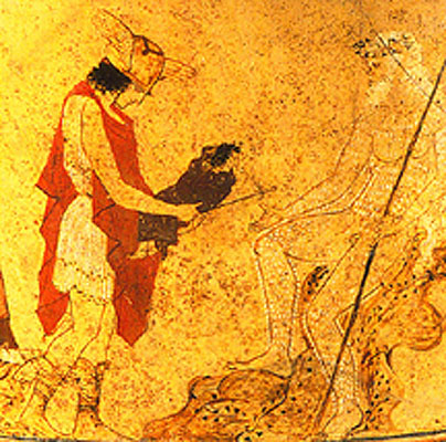 Above right: Hermes and satyr. Detail from Athenian red-figure clay vase, about 525-475 BC. Berlin. Antikensammlung F2160 © Berlin. Antikensammlung.