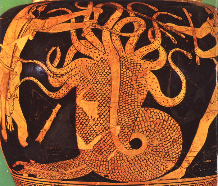 Detail from an Athenian red-figure clay vase, about 450-500 BC. Palermo. Regional Archaeological Museum V763.Herakles attacking Hydra. Cretan coin. <i>Obv. c.</i> 352 BC. ParisA snake-like monster, living at Lerna in the Argolid, with numerous heads, which Herakles had to destroy as his Second Labour. As fast as the hero cut off one head, another (or two more) grew up in its place. Herakles therefore enlisted the aid of his companion and charioteer Iolaos, who used firebrands to cauterise each stump severed by Herakles, until eventually the monster was slain. In later classical art the creature is given a human head. Its blood was poisonous and Herakles kept some to tip his arrows; in early scenes Athena is shown holding a small flask for it.