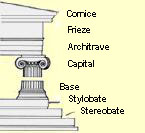 IONIC - An architectural order devised in East Greece (Ionia) in the 6th century BC, deriving from earlier floral and furniture patterns of oriental type. Its columns have fluted shafts, elaborately moulded disc bases and volute capitals. The upperworks have a continuous