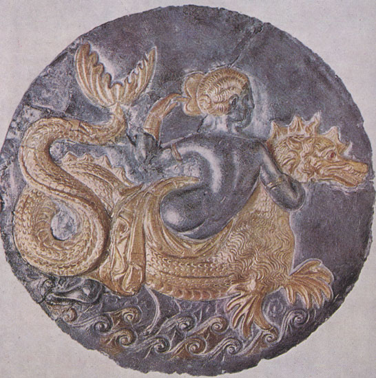 Above: Lid of silver box with relief of Nereid riding a serpent. Late second century BC. Taranto, National Museum 22429 © Photo: Max Hirmer