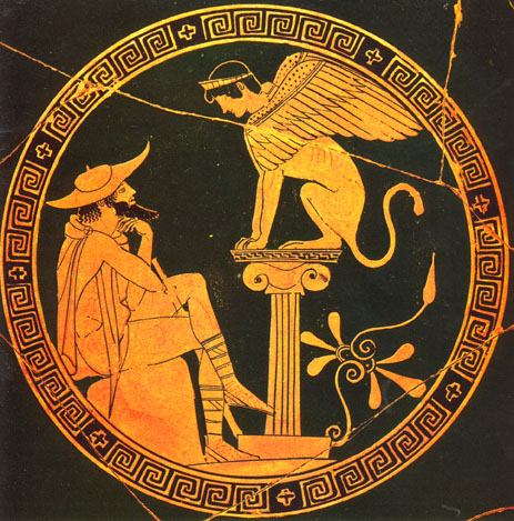 Detail from an Athenian red-figure clay cup, about 470 BC. Rome, Musei Vaticani 569.Son of the mythical King Laios of Thebes (in central Greece), but brought up by a shepherd and ignorant of his true identity. He inadvertently killed his father and married his mother Jocasta. On discovering what he had done, he blinded himself in a frenzy of grief and left Thebes. He went to Athens where he was succoured by his daughters. As a newcomer to Thebes he confronted the Sphinx and solved her riddle, thus freeing the city from a monster that was consuming her young men.
