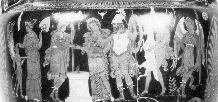 Above: Oinomaos's oath with Pelops. Detail from Apulian red-figure clay vase c. mid 4th century BC. St. Petersburg State Hermitage Museum 4323 © State Hermitage Museum