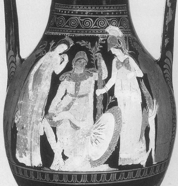 Paris and Hermes. Detail from an Athenian black-figure clay vase, about 530 BC. Palermo, Banco di Sicilia 97.Judgment of Paris. Detail from Athenian red-figure clay vase, about 400-300 BC. Malibu. The J. Paul Getty Museum 83.AE.10Also known as Alexandros. Son of King Priam of Troy, but brought up by herdsmen and therefore often shown as a shepherd prince. His Judgement in favour of Aphrodite brought about the Trojan War in which he fought as an archer, fatally wounding Achilles.